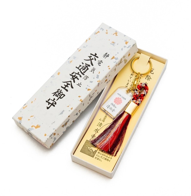 ◎ご利益 交通安全 ◎カラー 赤、青 ◎本体寸法 タテ約9.5㎝(箱の寸法は約15.7㎝) ◎特徴 播州清水寺住職がご祈祷した御守です。 七色房で編まれた御守りです。七色房は厄災から身を守る魔除けになると伝えられています。また、静電気防止にもなる房を手に触れるようにしてお使いください。 鍵を収納するのに便利なリングのキーホルダータイプとなります。 ※税込価格となっておりますが、お守りに消費税はかかりませんので正しくは税無し1,000円となります。